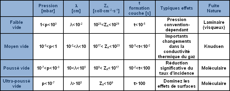 Sur ce tableau, les zones de vide sont réparties en fonction de la pression, avec indication des caractéristiques et des effets typiques. Le symbole ? (lambda) représente « le libre parcours moyen », c’est-à-dire la longueur moyenne du parcours effectué par une molécule entre un choc et le choc suivant, ZA représentant le nombre de collisions de la molécule sur une surface par unité de temps et tformazione strato le temps nécessaire pour couvrir d’une couche de gaz de l’épaisseur d’une molécule une surface propre dans une enceinte où le vide a été fait.