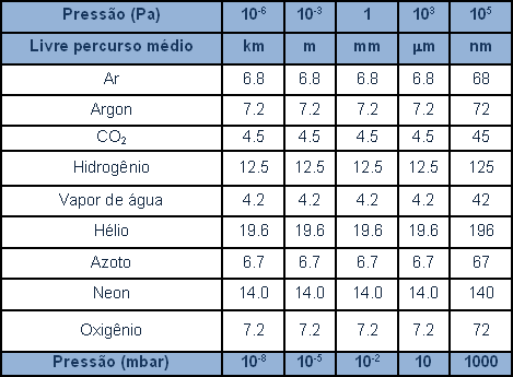 A tabela a seguir liga o percurso livre médio de diferentes gases com pressões diferentes.